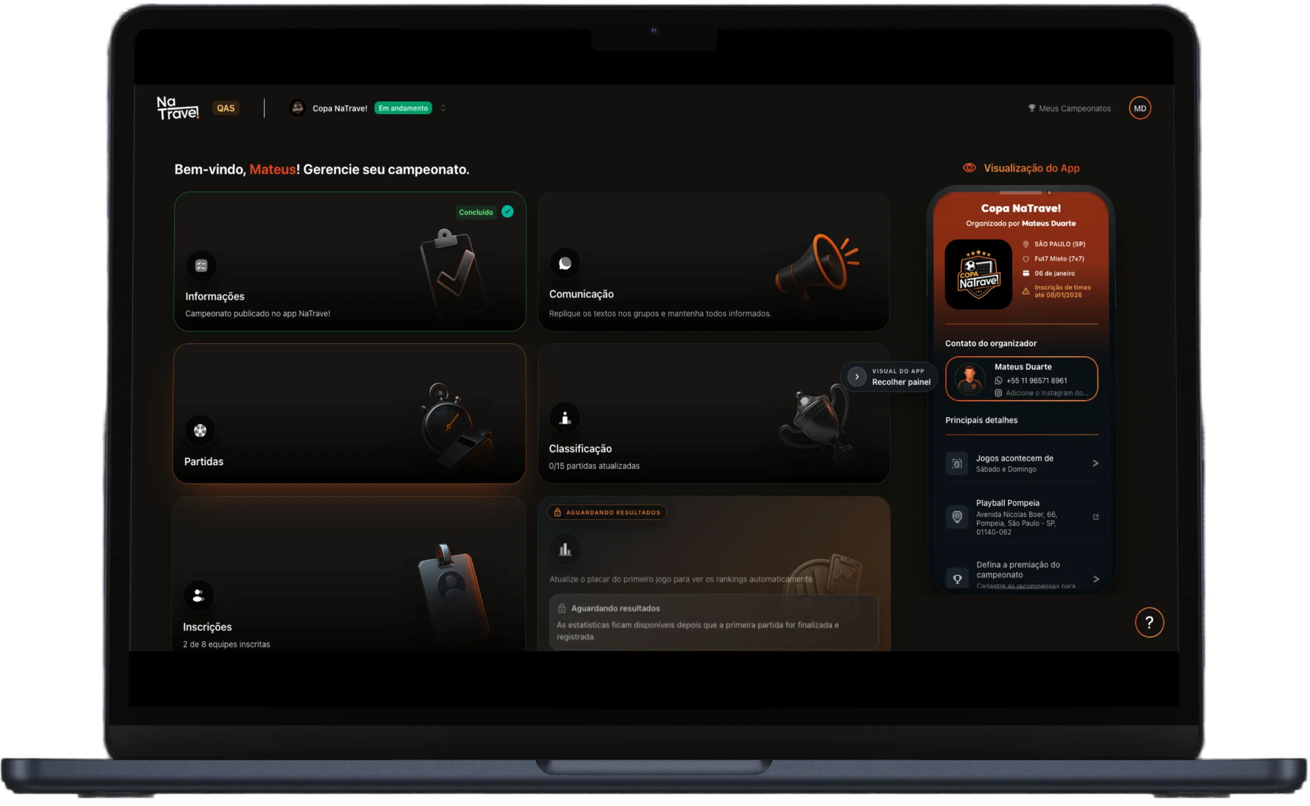 NaTrave! Campeonatos é a melhor plataforma para organizar campeonatos de futebol do Brasil. Você cadastra seu campeonato, configura os detalhes e publica ele em um app que será usado pelos participantes para acompanharem as inscrições, partidas, classificação e estatísticas.